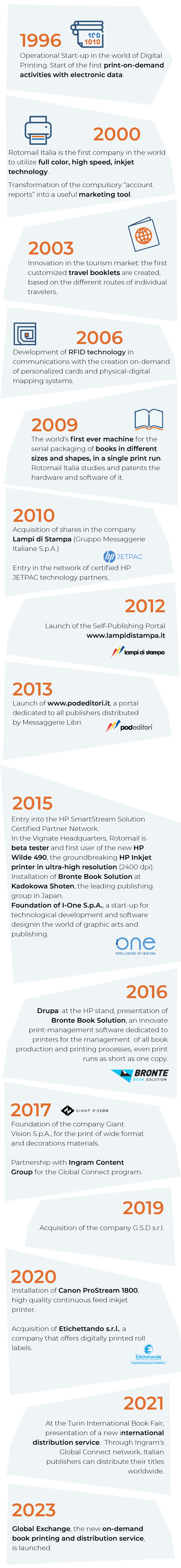 From being the forerunners of transpromo communications to the development of innovative portals for the creation of travel books and booklets: Our story tells the constant path of research and development of solutions capable of anticipating and interpreting the needs of the markets.
